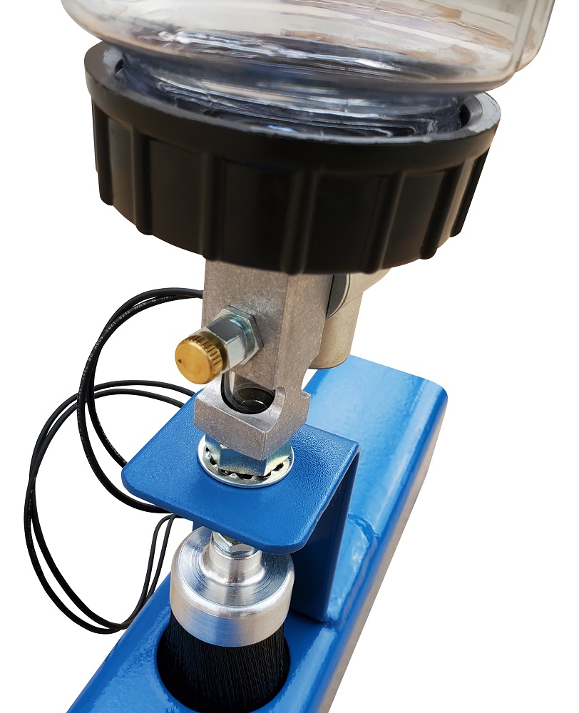 The Ultimation U11133 automatic lubricator is the ideal solution for keeping your Unibilt chain and trolleys lubricated and running smoothly. The brush-style lubricator drip-feeds the lubricant from the glass receptacle into the brush head, which then brushes the lubricant onto the trolley wheels or chain as they moved through the connected portion of the track. Including a “Z” style mounting bracket and a 1′ Unibilt track section, this bundle fits perfectly into most Unibilt overhead conveyor systems. This brush-type automatic lubricator is the perfect component for providing oil lubrication to the guide and load wheel bearings, as well as to each pivot in the chain assembly. Engineered with an electric On/Off valve, this automatic lubricator can be adjusted to operate automatically when the conveyor is running.