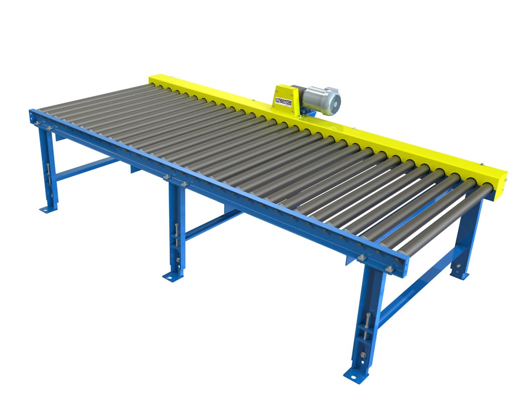 Ultimation’s Chain Driven Live Roller Conveyor (CDLR) is an ideal solution for transporting products such as pallets, drums, crates, and other heavy items. This plug-and-play heavy-duty CDLR has a sleek powder-coated Ultimation Blue finish with Safety Yellow guards. With Jackbolt conveyor supports that measure 30” high and adjust +/- 2”, as well as a 1/2 HP, 208-230/460 VAC/3PH/60HZ, TEFC motor; this CDLR is the perfect solution for warehousing & distribution applications, automotive applications, manufacturing applications, and more.